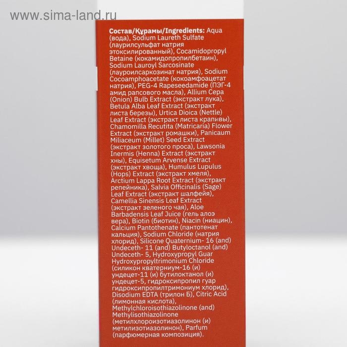 Состав: вода, лаурилсульфат натрия этоксилированный, кокамидопропилбетаин, лауроилсаркозинат натрия, кокоамфоацетат натрия, ПЭГ-4 амид рапсового масла, экстракт лука, экстракт листа березы, экстракт листа крапивы, экстракт цветков ромашки, экстракт семян проса, экстракт хвоща, экстракт корней лопуха, экстракт листьев шалфея, экстракт листьев зелёного чая, гель алоэ вера, биотин, ниацин, пантотенат кальция, натрия хлорид, силикон кватерниум-16 (и) ундецет-11 (и) бутилоктанол (и) ундецет-5, гидроксипропил гуар гидроксипропилтримониум хлорид, трилон Б, лимонная кислота, метилхлороизотиазолинон (и) метилизотиазолинон, парфюмерная композиция, краситель Cl15985.