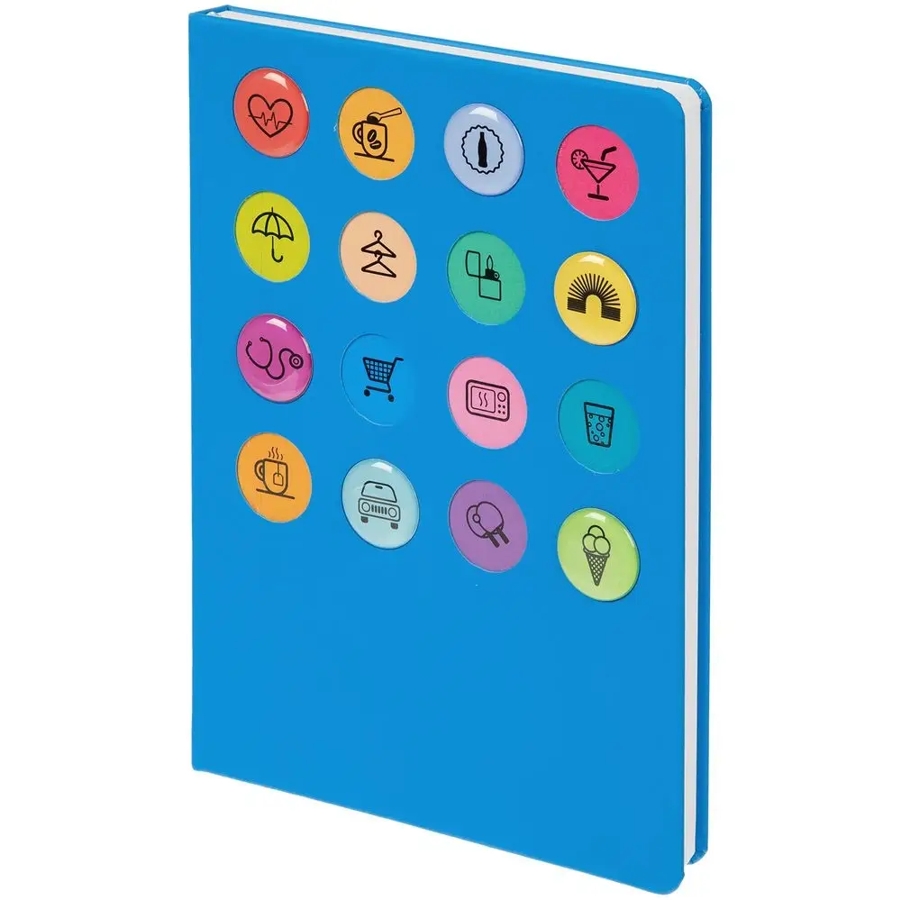 Обложка ежедневника из материала Soft Touch. На корешке обложки выполнено блинтовое тиснение, обложка дополнена вырубкой с печатью на бумаге и полимерными наклейками под смолой.