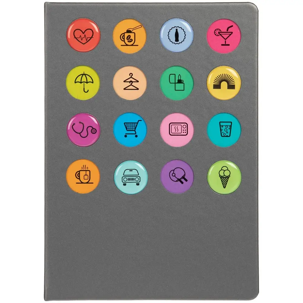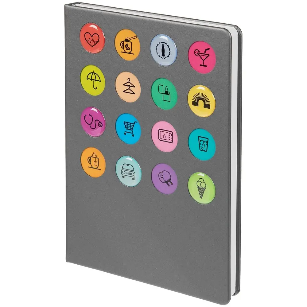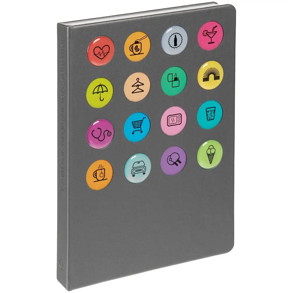 Обложка ежедневника из материала Soft Touch. На корешке обложки выполнено блинтовое тиснение, обложка дополнена вырубкой с печатью на бумаге и полимерными наклейками под смолой.