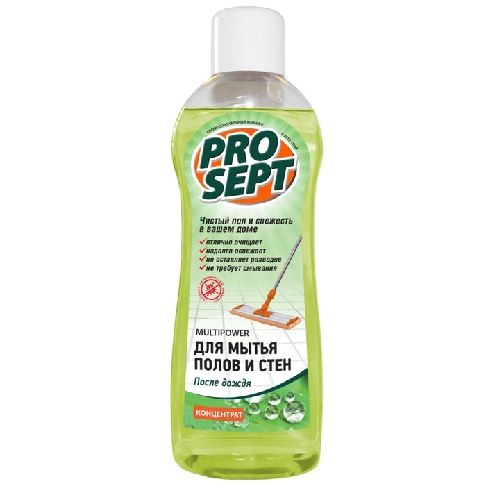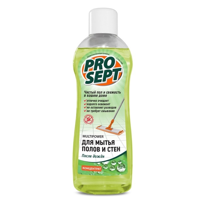 Концентрат для мытья полов и стен Prosept – концентрированное средство, сочетающее в себе экономичность в применении, высокоэффективные моющие свойства и приятный аромат чистоты и свежести после дождя.