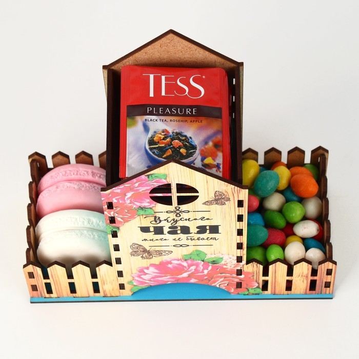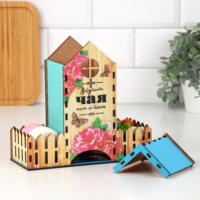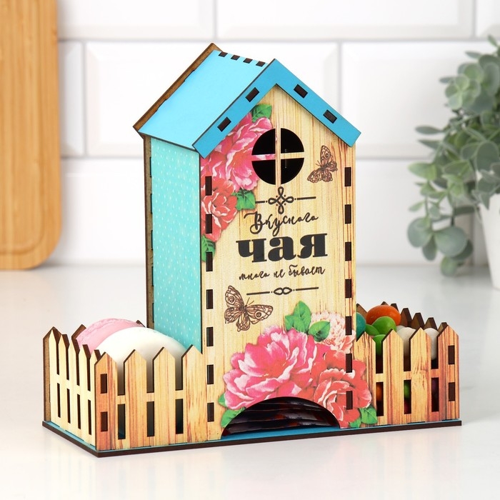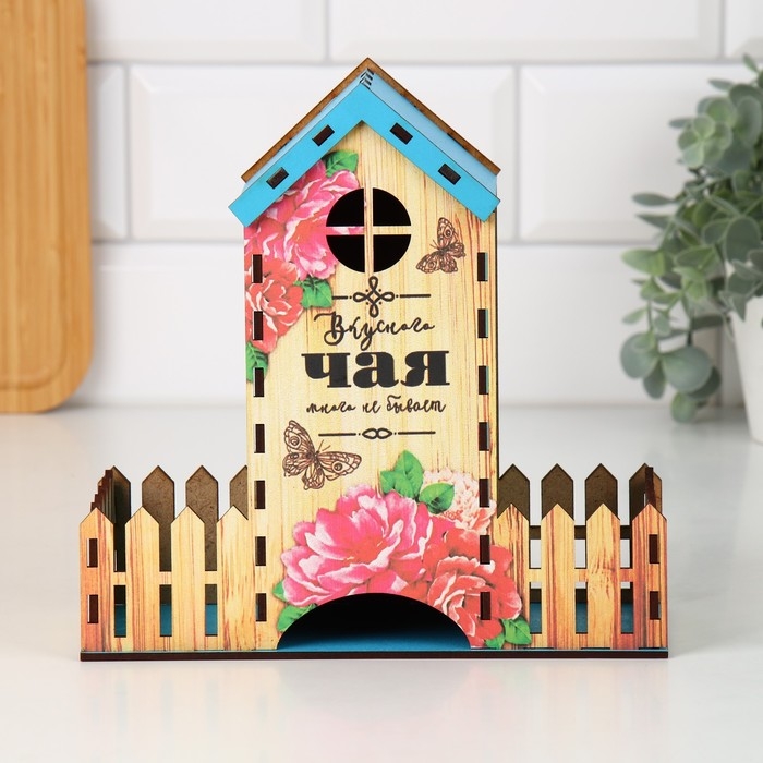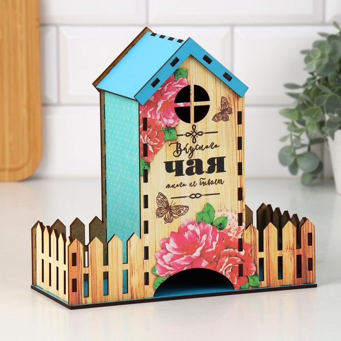 Чайный домик – это необычная упаковка для хранения чая. Он поможет навести порядок на обеденном столе, а также станет его яркой деталью. Чайные пакетики закладываются сверху внутрь домика и вынимаются снизу.