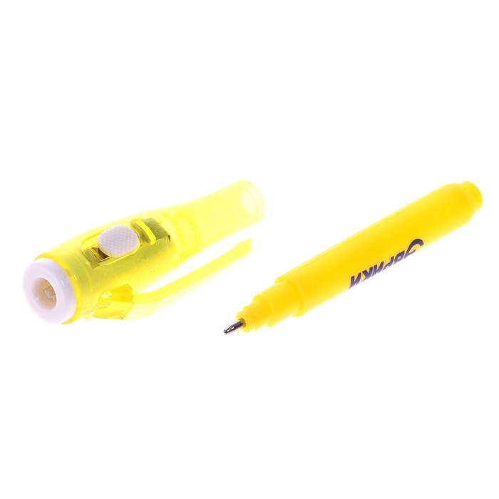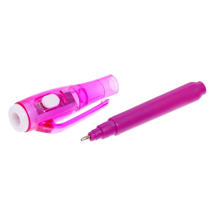 У волшебной ручки есть ещё одна функция — невидимые чернила. Снимите колпачок и напишите что-нибудь на листе бумаги, а затем посветите на надпись фонариком. Рисунок проявится.