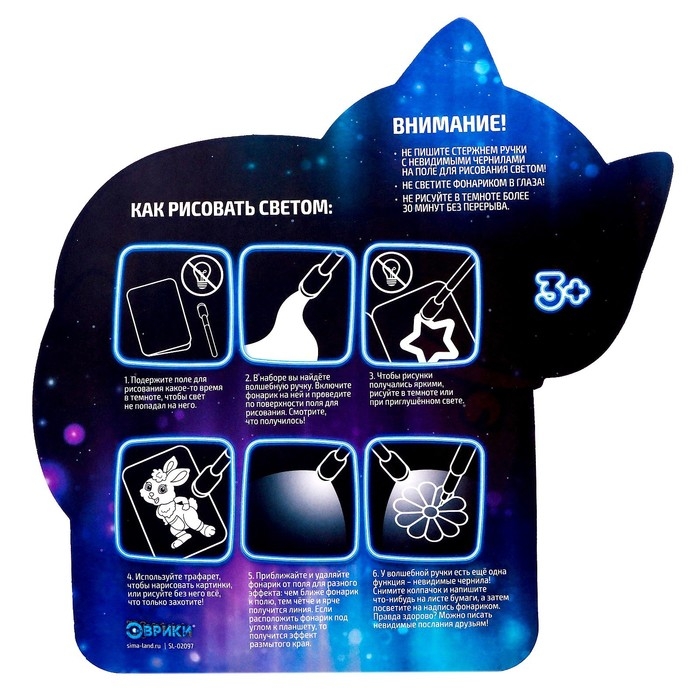 С помощью набора «Рисуем светом» и специального маркера ребёнок научится рисовать светом. Малыш будет создавать картинки, используя трафареты, или придумает собственные сюжеты.