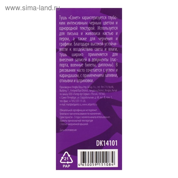 Тушь для письма и рисования "Сонет", 100 мл, чёрная, DK14101