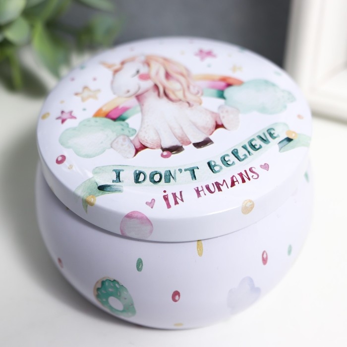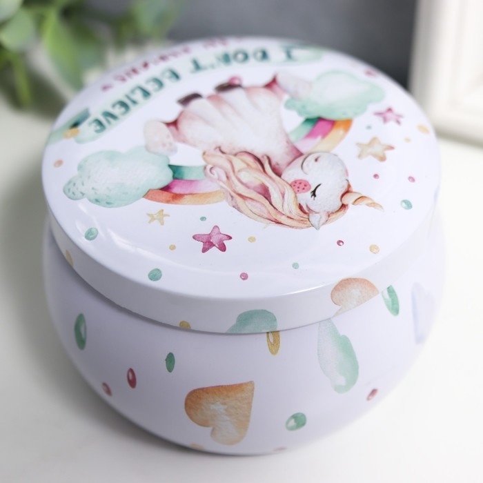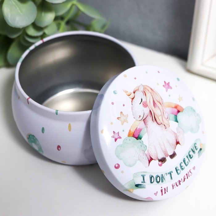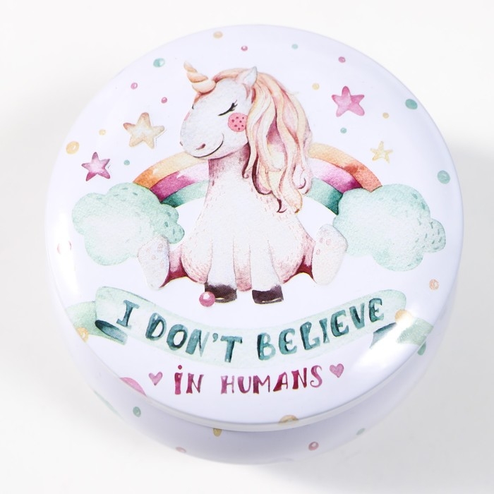 Шкатулка металл круг "Единорог и радуга" выпуклый рисунок 5х7,5х7,5 см