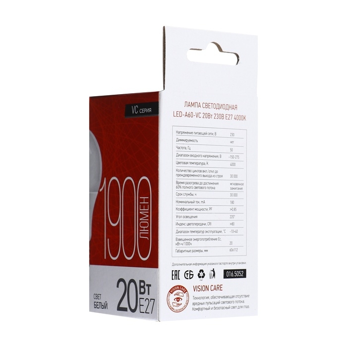 Ваш ребенок теряет зрение, делая уроки при искусственном освещении? Уникальная технология «VISION CARE» полностью исключает мерцание и вредные пульсации, поэтому лампы серии LED-VC не вызывают раздражение и усталость глаз, а значит безопасны для здоровья. При этом они максимально экономичны – по сравнению с лампами накаливания, вы заплатите за освещение в 9-10 раз меньше. Лампа классической грушевидной формы подойдет для всех светильников со стандартным цоколем Е27.