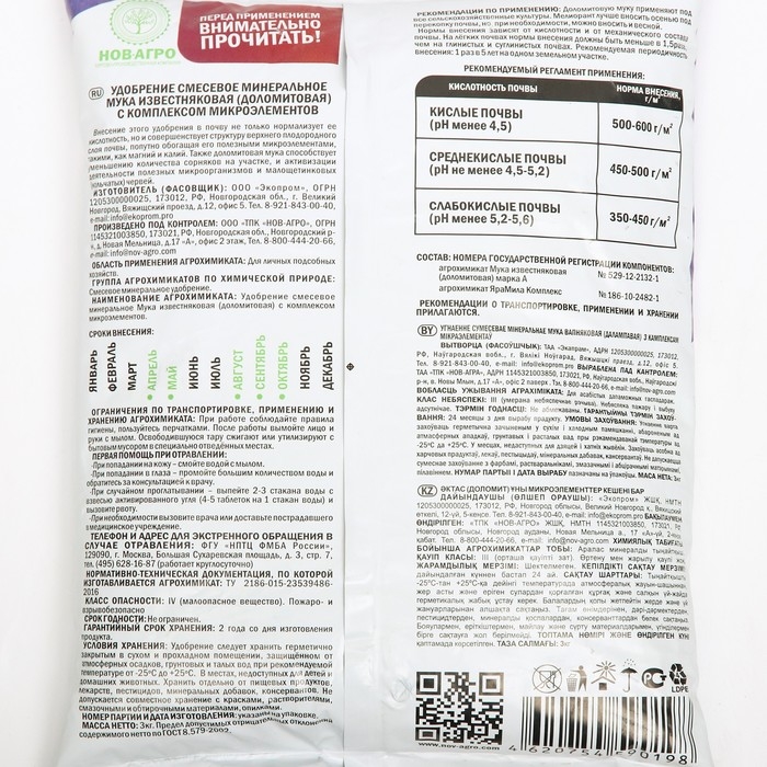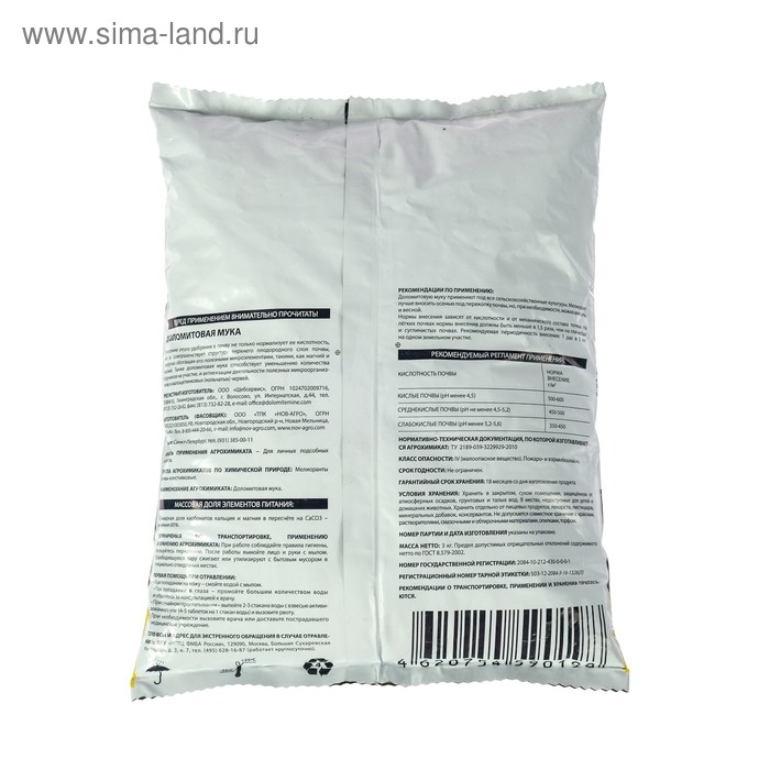 Известняковая (Доломитовая) мука —предназначена для известкования кислых почв, обогащения ее кальцием и магнием. Почва после добавления муки становится более рыхлой, усиливается жизнедеятельность полезных для возделывания культур микроорганизмов, повышается эффективность вносимых удобрений.