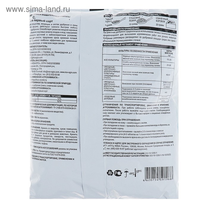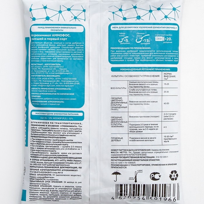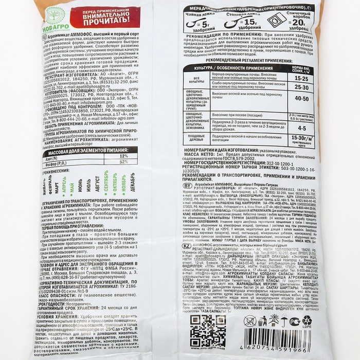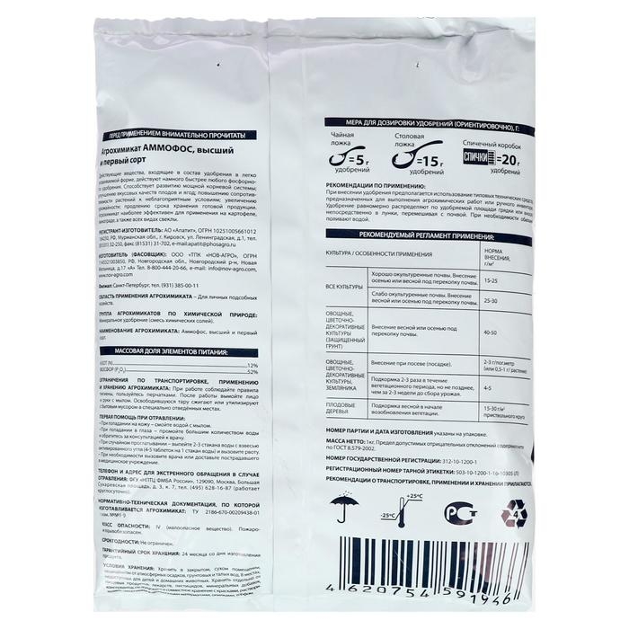 Аммофос – моноаммонийфосфат (NH4H2PO4) – это сложное удобрение, получаемое в результате реакции нейтрализации фосфорных кислот аммиаком. В его состав входят 42-52 % фосфора и 10-12% аммонийного азота. Фосфор содержится в водорастворимой форме. Таким образом, аммофос – это водорастворимое безнитратное удобрение с достаточно большой концентрацией действующих элементов, удобрение для растений, которое подойдет для любых грунтов и растительных культур, вне зависимости от того, открытый это будет грунт, или защищенный (теплицы).
