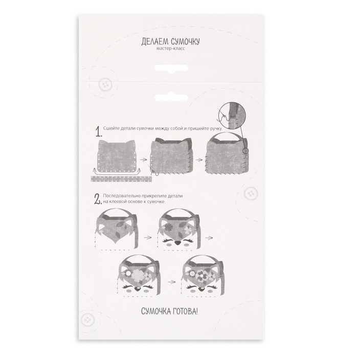 Ваша маленькая модница будет в восторге, ведь теперь она сама сможет стать дизайнером сумки и сшить ее! Выберите понравившийся набор и вместе с малышом создайте сумочку из фетра. Если вам кажется это сложным для ребенка, то спешим уверить в обратном, все просто! Ведь такой набор предусмотрен для детей от 3 лет, у сумки есть перфорация и клеевой фетр, она легко сшивается пластиковой иглой. Материалы безопасны для ребенка, чтобы выполнить такую поделку, достаточно следовать инструкции на обороте.