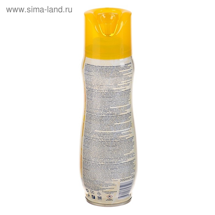 Состав: смесь пропана, бутана и изобутана (> 30%); растворитель (< 5%), парфюмерная композиция (< 5%), эфирные масла (< 5%), бензиловый спирт, бензилсалицилат, линалоол.