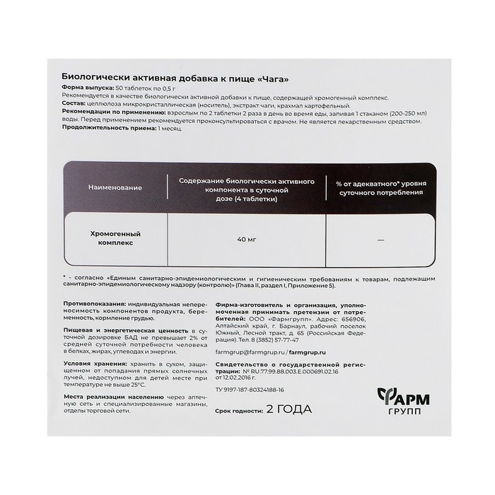 Состав: МКЦ (Е460), экстракт чаги, крахмал картофельный.