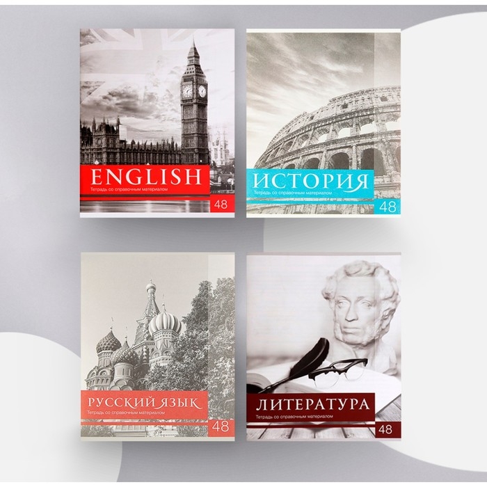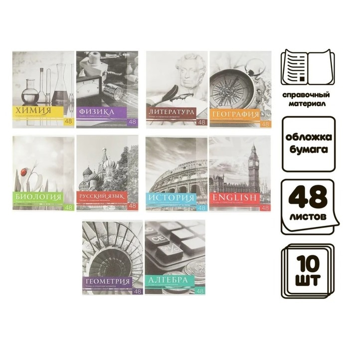 Комплект предметных тетрадей 48 листов, "Чёрное-белое", 10 предметов со справочным материалом, обложка мелованная бумага, блок №2, белизна 75% (серые листы)