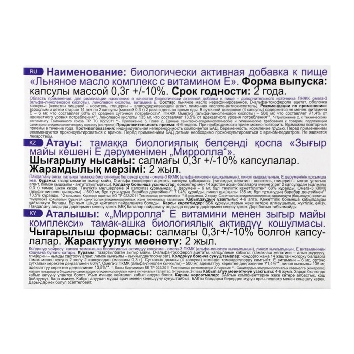 Состав 1 капсулы: льняное масло, глицерин (Е422) — пластификатор.