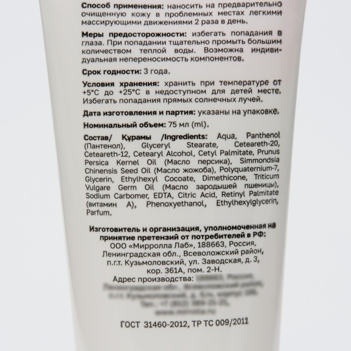 Состав: aqua, Panthenol (Декспантенол), Glyceryl Stearate (and) Ceteareth-20 (and) Ceteareth-12 (and) Cetearyl Alcohol (and) Cetyl Palmitate, Prunus Persica Kernel Oil (Масло персика), Simmondsia Chinensis Seed Oil (Масло жожоба), Cetearyl Alcohol, Gliceryl Stearate, Glycerin, Ethyl Hexyl Cocoate, Dimethicone, Triticum Vulgare Germ Oil (Масло зародышей пшеницы), Carbomer, EDTA, Citric Acid, Retinyl Palmitate (витамин А), 2-bromo-2-nitropropane-1,3-diol, Parfum.