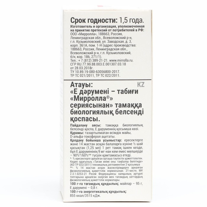 Витамин Е Mirrolla, токоферол природный, 50 мл