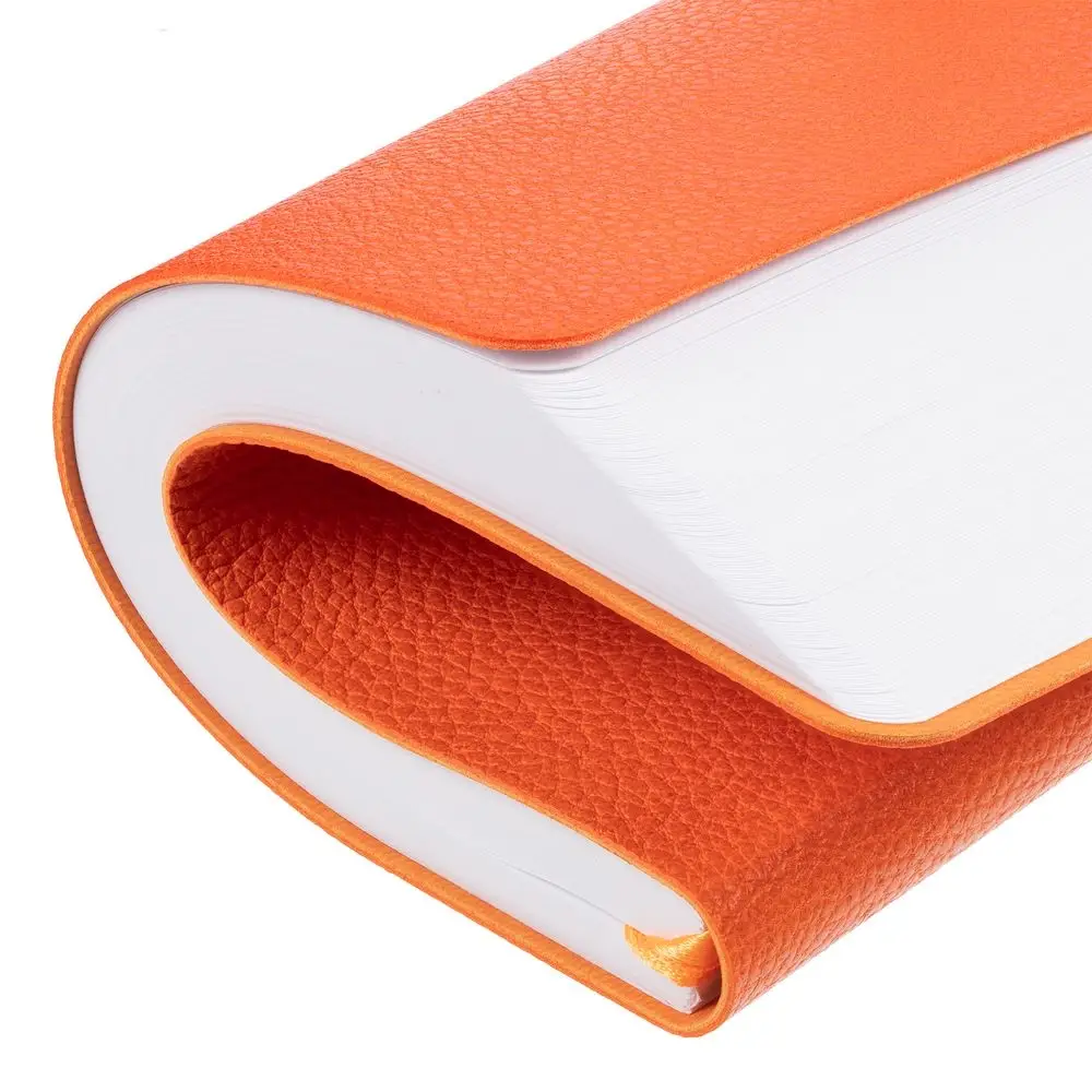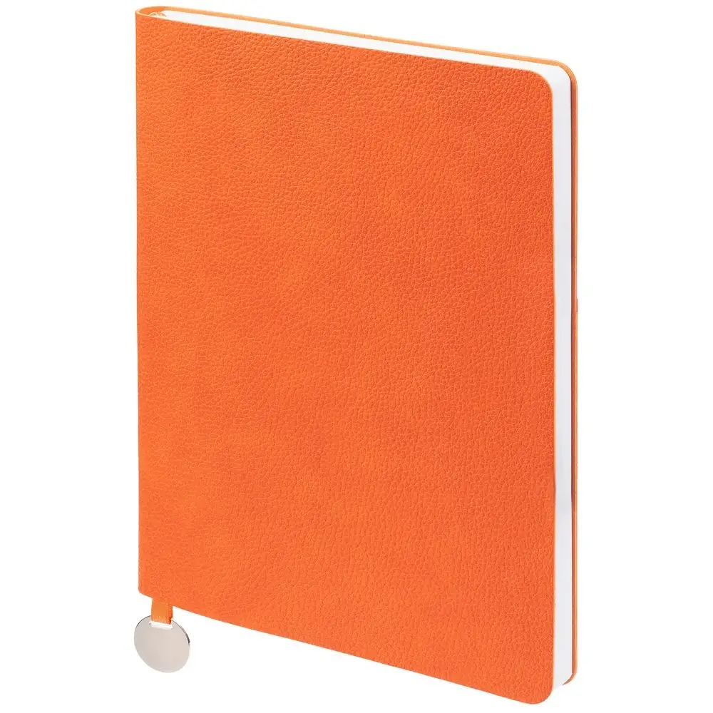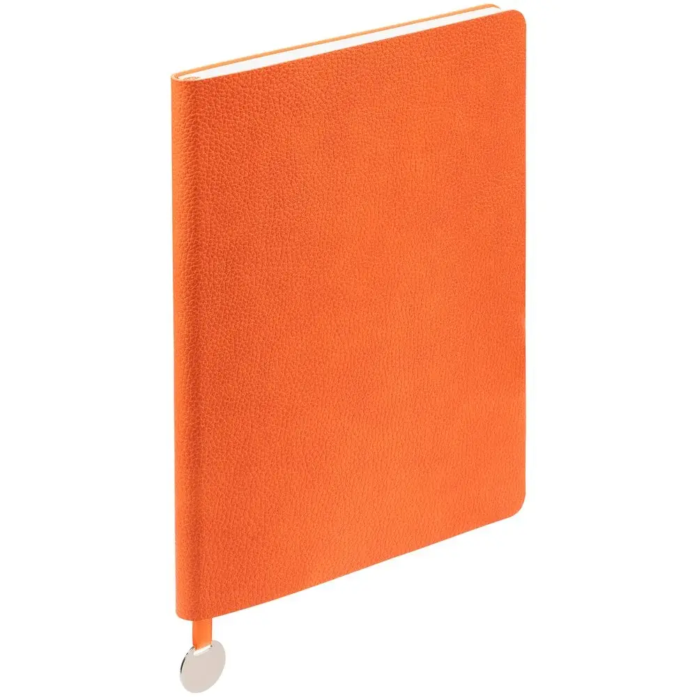 Ежедневник с гибкой обложкой, выполнен из материал La Fite, оранжевый ОО, дополнен ляссе в цвет обложки с металлическим шильдом.