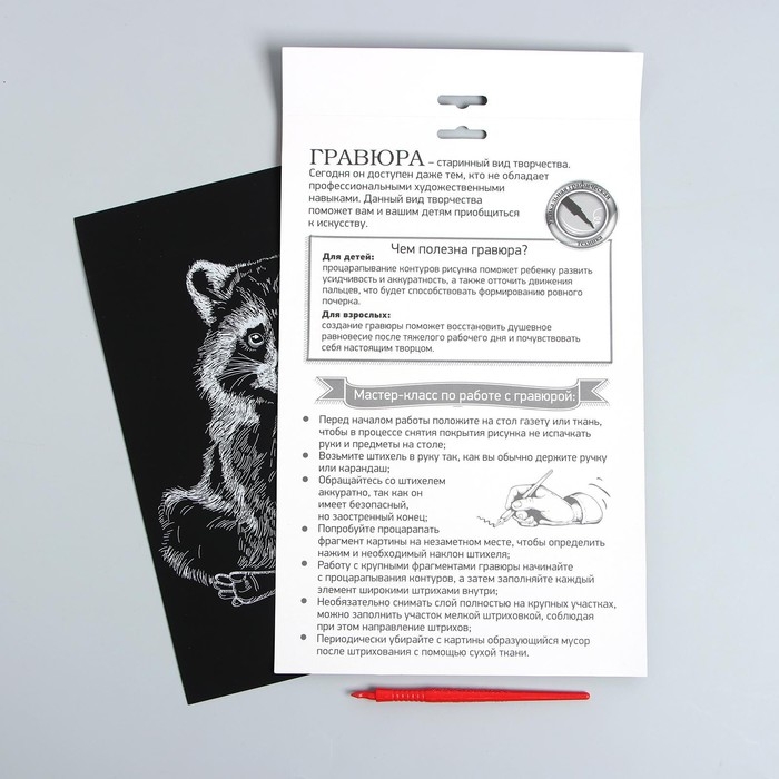 Чтобы создать невероятно красивую гравюру, достаточно процарапать намеченные контуры рисунка специальным инструментом — штихелем. И дети, и взрослые будут с удовольствием соскребать верхний слой гравюры с контурами будущей картины, под которым находится сверкающая фольга — ведь это так увлекательно!