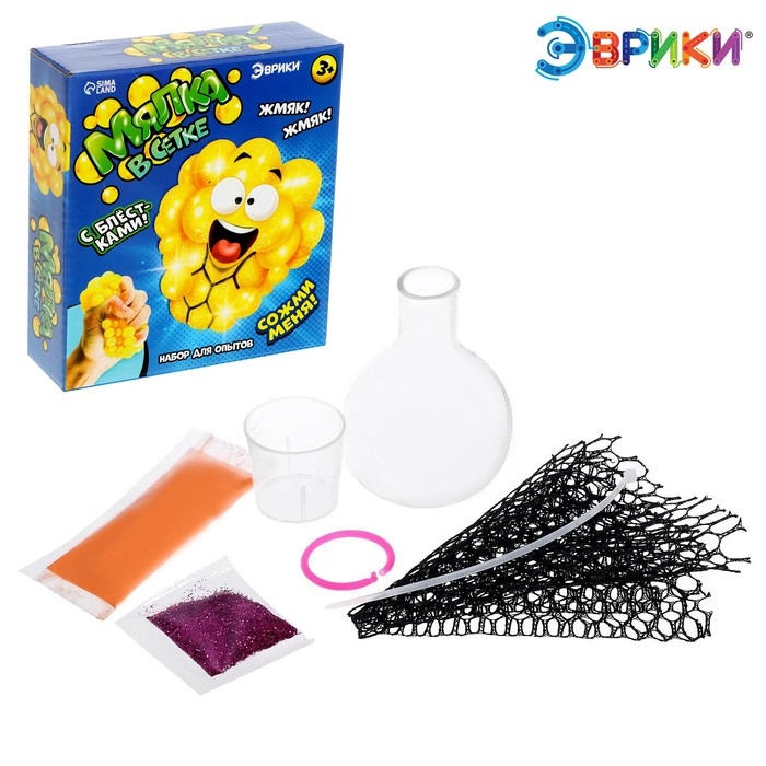 Набор для опытов «Мялка в сетке» позволит ребёнку провести увлекательный эксперимент по химии и создать необычную игрушку-антистресс своими руками.