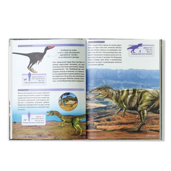 - С этой красочной энциклопедией ваш ребёнок совершит настоящее путешествие в прошлое и познакомится с самыми разными видами динозавров.