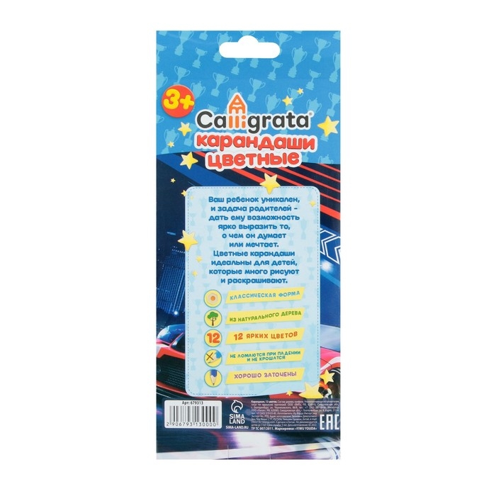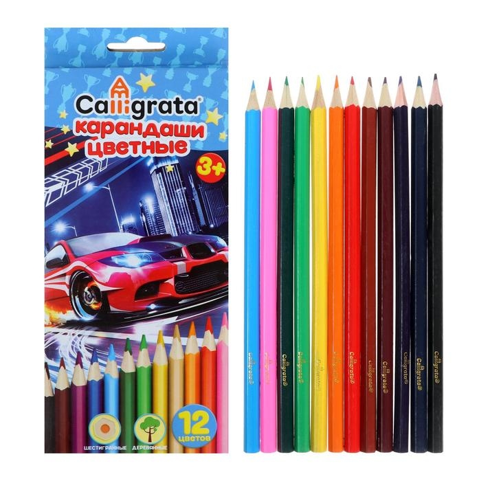 Карандаши цветные 12 цветов, "Машинка", корпус деревянный, шестигранный