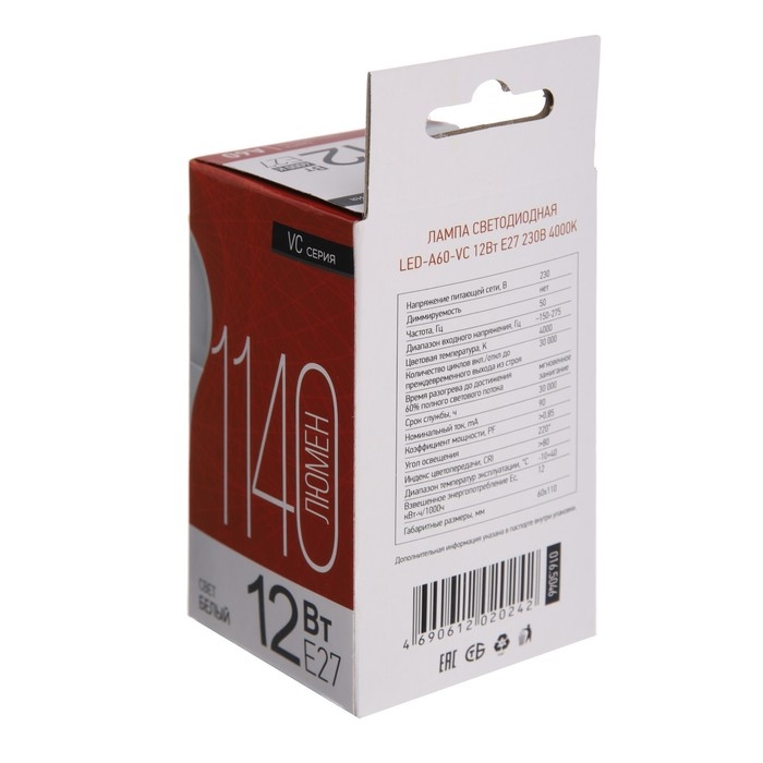 Лампа светодиодная IN HOME LED-A60-VC, Е27, 12 Вт, 230 В, 4000 К, 1140 Лм