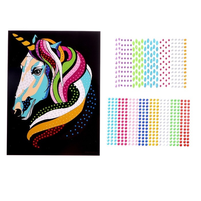 На основе расположена разноцветная картинка. Расположите на ней нужной формы и нужного размера стразы в соответствии с контуром-подсказкой. Творить могут даже самые маленькие: клей и ножницы не понадобятся.