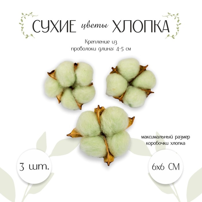 Сухие цветы хлопка, набор 3 шт., размер 1 шт. 6 × 6 см, цвет зелёный
