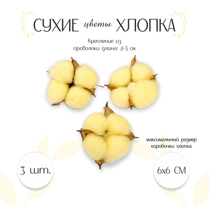 Сухие цветы хлопка, набор 3 шт., размер 1 шт. 6 × 6 см, цвет жёлтый