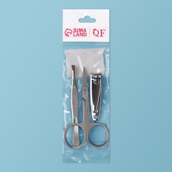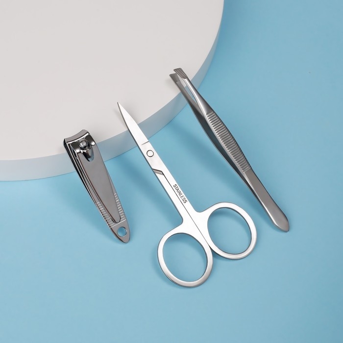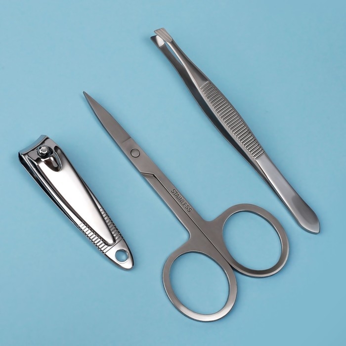 Набор состоит из широких, загнутых ножниц, книпсера и пинцета.