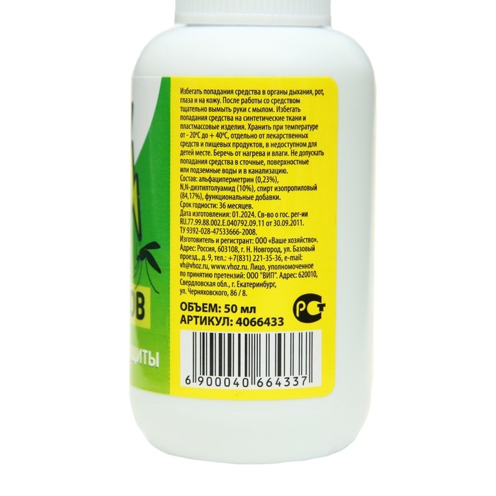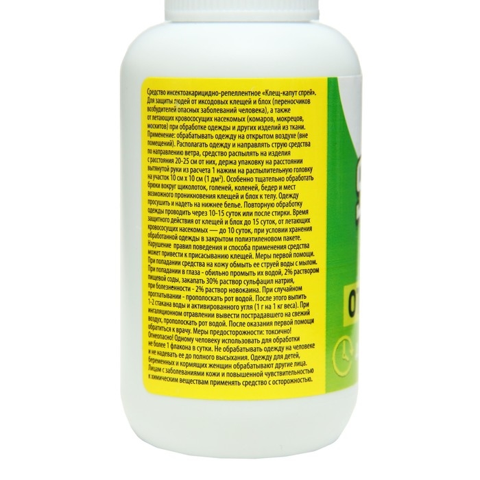 Средство инсектоакарицидно-репеллентное "Клещ-капут спрей". Для защиты людей от иксодовых клещей и блох (переносчиков возбудителей опасных заболеваний человека), а также от летающих кровососущих насекомых (комаров, мокрецов, москитов) при обработке одежды и других изделий из ткани.Применение: обрабатывать одежду на открытом воздухе (вне помещений). Располагать одежду и направлять струю средства по направлению ветра, средство распылять на изделия с расстояния 20-25 см от них, держа упаковку на расстоянии вытянутой руки из расчета 1 нажим на распылительную головку на участок 10 см х 10 см (1 кв.дм). Особенно тщательно обработать брюки вокруг щиколоток, голеней, коленей, бедер и мест возможного проникновения клещей и блох к телу. Одежду просушить и надеть на нижнее бельё. Повторную обработку одежды проводить через 10-15 суток или после стирки.Время защитного действия от клещей и блох до 15 суток, от летающих кровососущих насекомых до 10 суток, при условии хранения обработанной одежды в закрытом полиэтиленовом пакете.Нарушение правил поведения и способа применения средства может привести к присасыванию клещей.Меры первой помощи: при попадании в глаза - обильно промыть их водой, 2% раствором пищевой соды, закапать 30% раствор сульфацил натрия, при болезненности - 2% раствор новокаина. При случайном проглатывании - прополоскать рот водой. После этого выпить 1-2 стакана воды и и активированного угля (1 г на 1 кг веса). При ингаляционном отравлении вывести пострадавшего на свежий воздух, прополоскать рот водой. После оказания первой помощи обратиться к врачу.Меры предосторожности: токсично! Огнеопасно! Одному человеку использовать для обработки не более 1 флакона в сутки. Не обрабатывать одежду на человеке и не надевать ее до полного высыхания. Одежду для детей, беременных и кормящих женщин обрабатывают другие лица. Лицам с заболеваниями кожи и повышенной чувствительностью к химическим веществам применять средство с осторожностью. Избегать попадания средства в органы дыхания, рот, глаза и на кожу. После работы со средством тщательно вымыть руки с мылом. Избегать попадания средства на синтетические ткани и пластмассовые изделия.Хранить при температуре от -20°C до +40°C, отдельно от лекарственных средств и пищевых продуктов, в недоступном для детей месте. Беречь от нагрева и влаги. Не допускать попадания средства в сточные, поверхностные или подземные воды и в канализацию.Состав: альфациперметрин (0,23%), N,N-диэтилтолуамид (10%), спирт изопропиловый (84,17%), функциональные добавки.