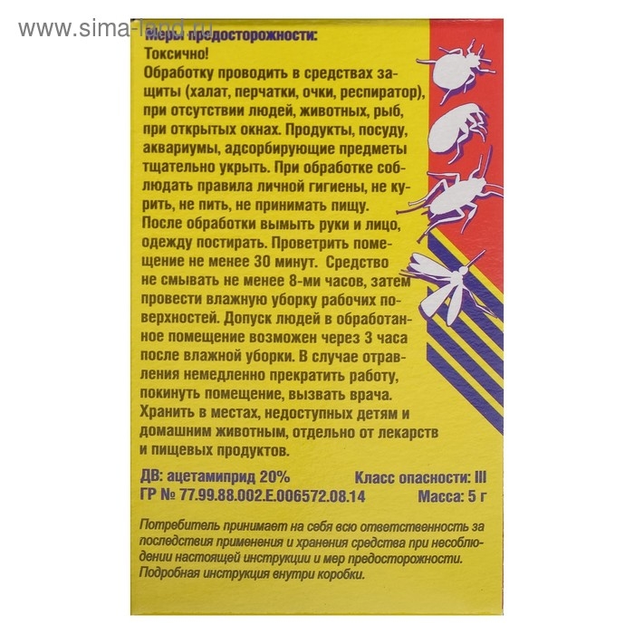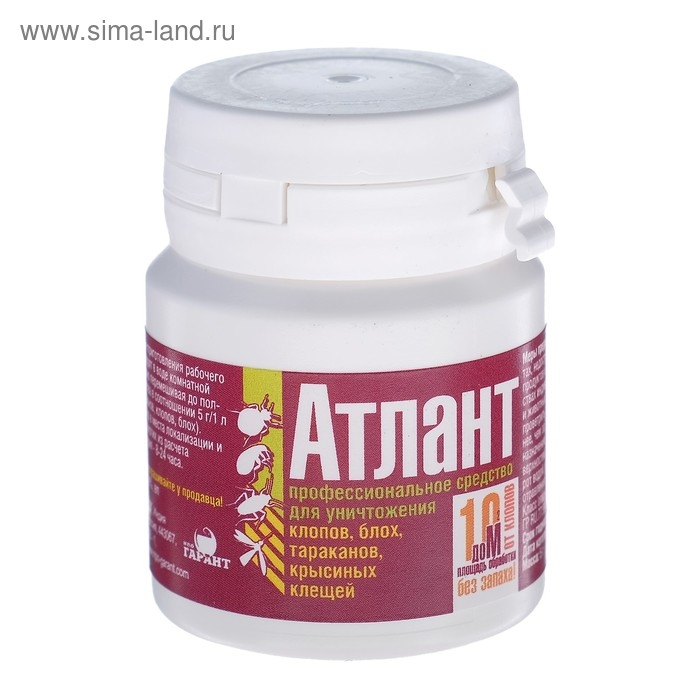 Назначение: для гарантированного уничтожения клопов, тараканов, блох, крысиных клещей.Средство представляет собой мелкодисперсный порошок голубого или белого цвета, который необходимо растворить в воде. Не оставляет следов на поверхности и образует стойкую невидимую плёнку. После контакта с ней насекомые гибнут в течение нескольких минут.Благодаря активному действующему веществу «Атлант» справляется с клопами, которые устойчивы к большинству средств. Содержимое упаковки рассчитано на приготовление 1 литра раствора для обработки до 10 м².Действующее вещество: ацетамиприд (20 %).