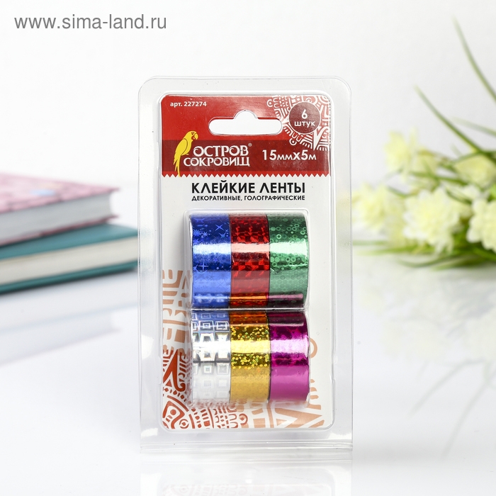 Клейкие ленты 15 мм х 5 м, декоративные голографические, (набор 6 шт) ассорти №1