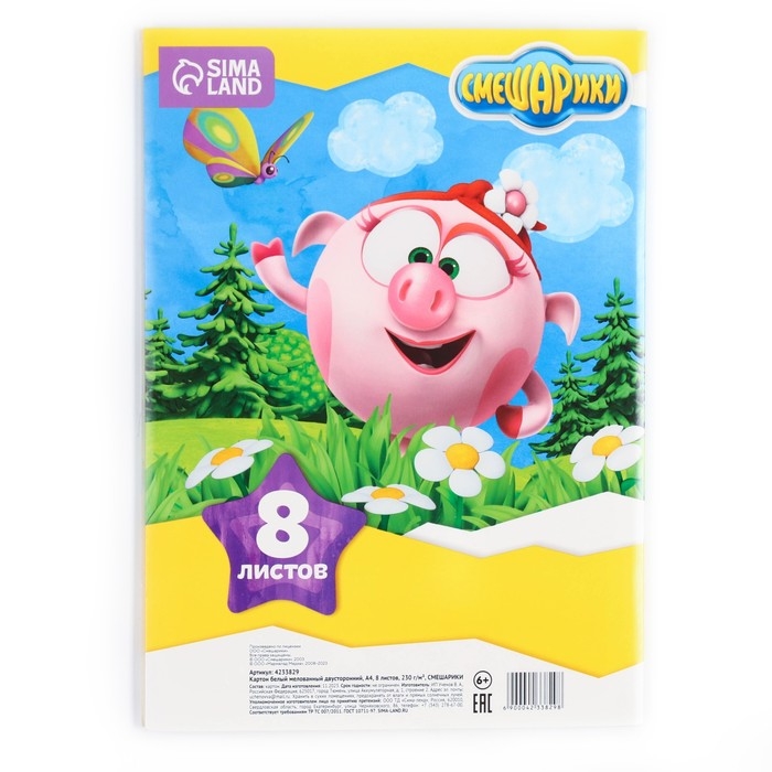 Картон белый, А4, 8 листов, мелованный, двусторонний, в папке, 230, г/м², Смешарики