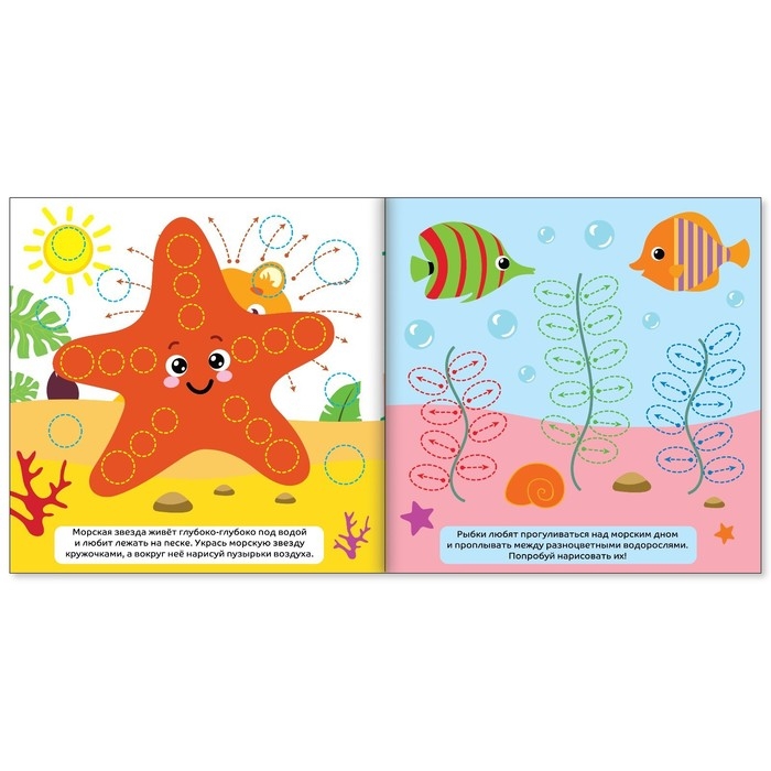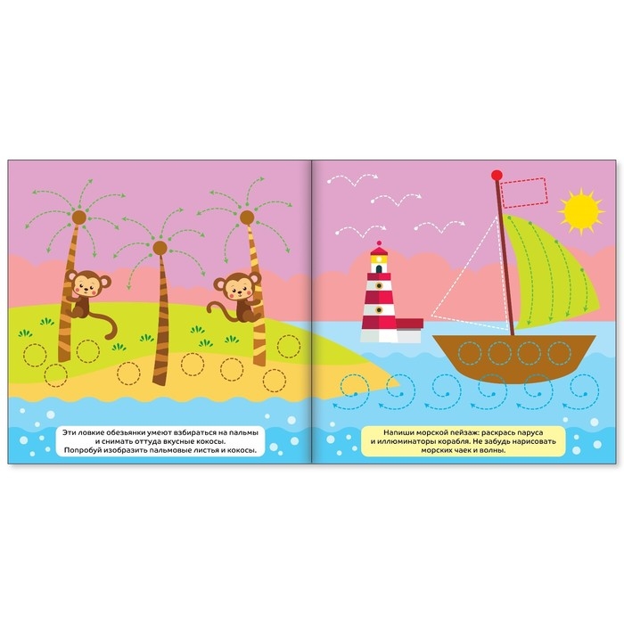 В книге на каждом рисунке есть стрелочки-подсказки, которые сориентируют малыша каким образом ему нужно дополнить картинку.
