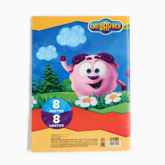 Картон цветной, А4, 8 листов, 8 цветов, немелованный, двусторонний, в папке, 220 г/м², Смешарики