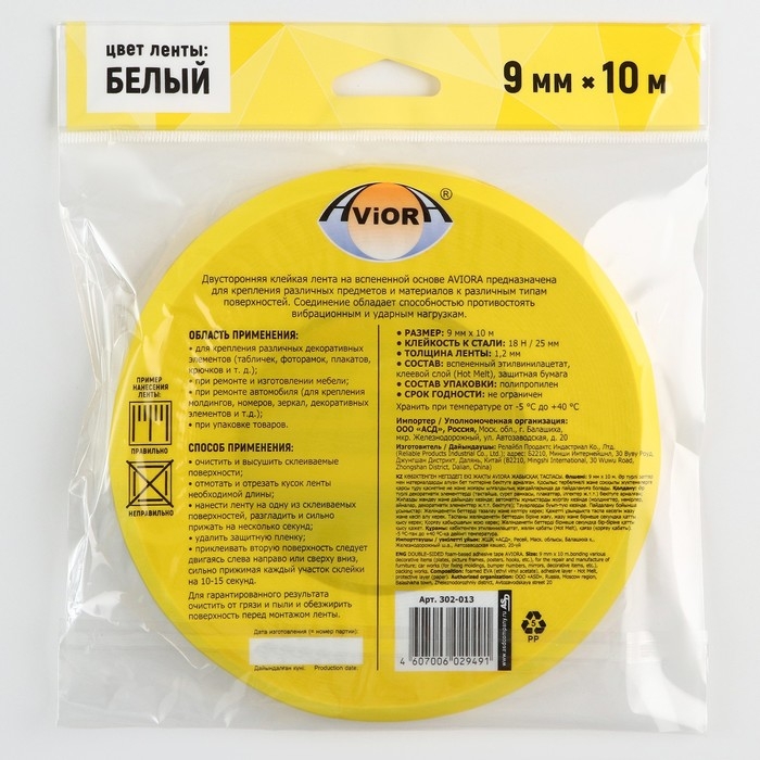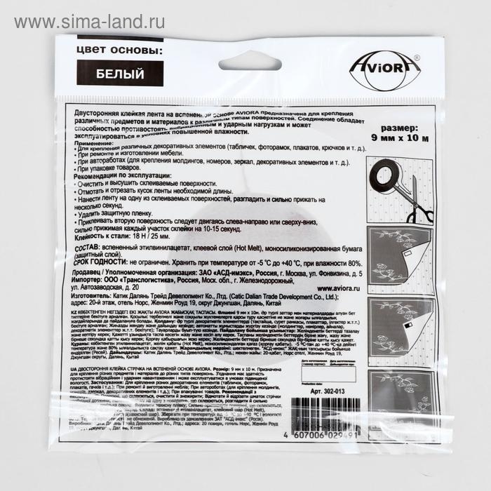 Двусторонняя клейкая лента Aviora, на вспененной основе, белая, 9 мм, 10 м