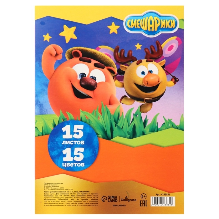 Картон цветной, А4, 15 листов, 15 цветов, мелованный, односторонний, в папке, 220 г/м², Смешарики