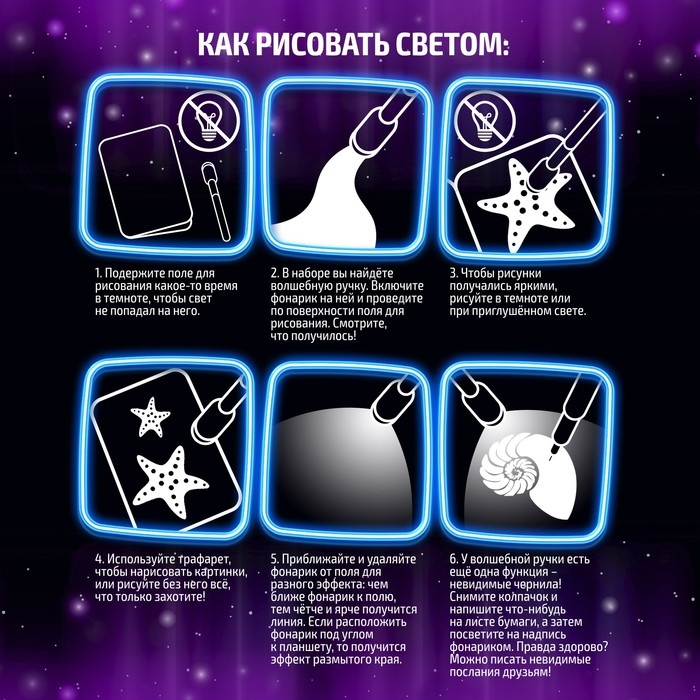 С помощью активити-книжки и специального маркера ребёнок научится рисовать светом. Малыш будет создавать картинки, используя трафареты, или придумает собственные сюжеты.