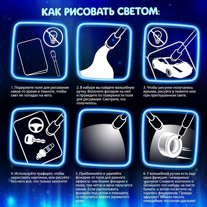 С помощью активити-книжки и специального маркера ребёнок научится рисовать светом. Малыш будет создавать картинки, используя трафареты, или придумает собственные сюжеты.