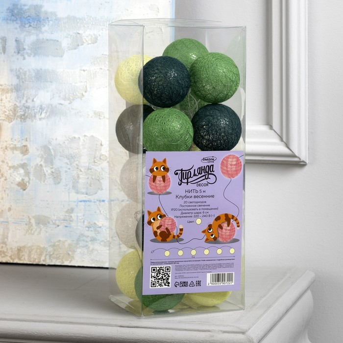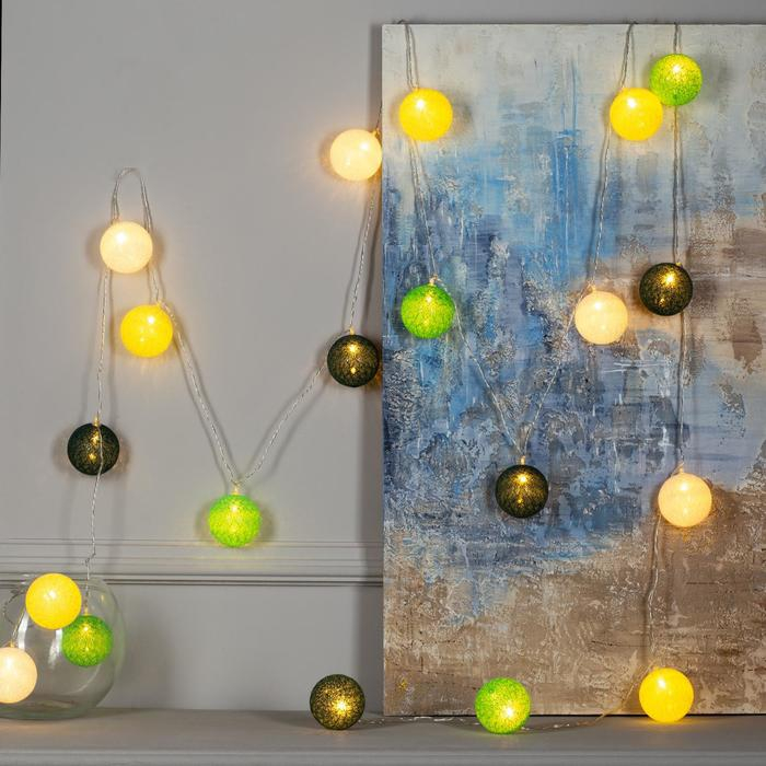 Гирлянда «Нить» 5 м с насадками «Клубки бело-зелёные», IP20, прозрачная нить, 20 LED, свечение тёплое белое, 220 В