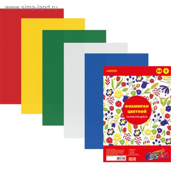 Фоамиран цветной самоклеящийся A4 "deVENTE" 5 цв, 5 л, толщина 2 мм, пластиковый пакет с европодвесом.