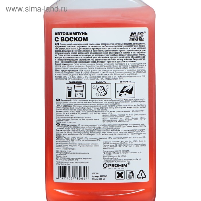Автошампунь ручной AVS с воском, 500 мл, AVK-001, контактный