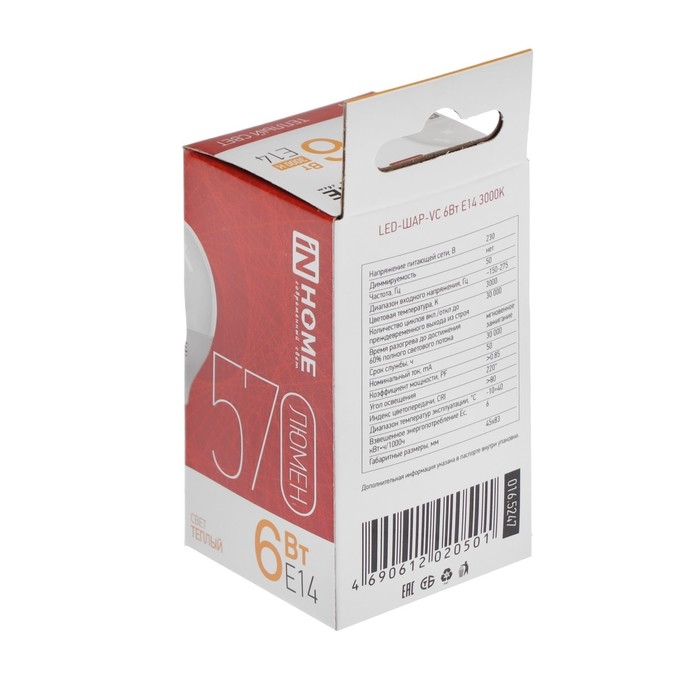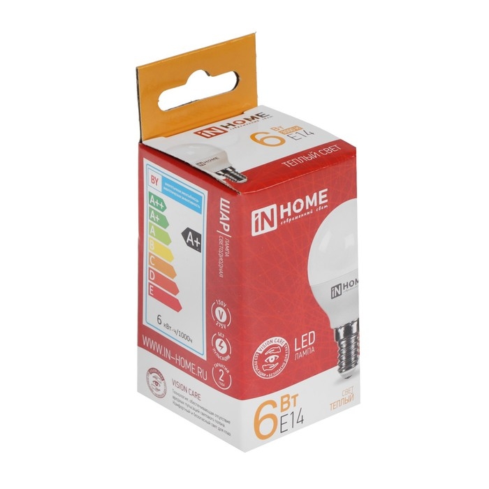 Лампа светодиодная IN HOME, Е14, G45, 6 Вт, 540 Лм, 3000 К, теплый белый