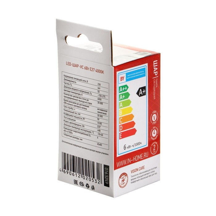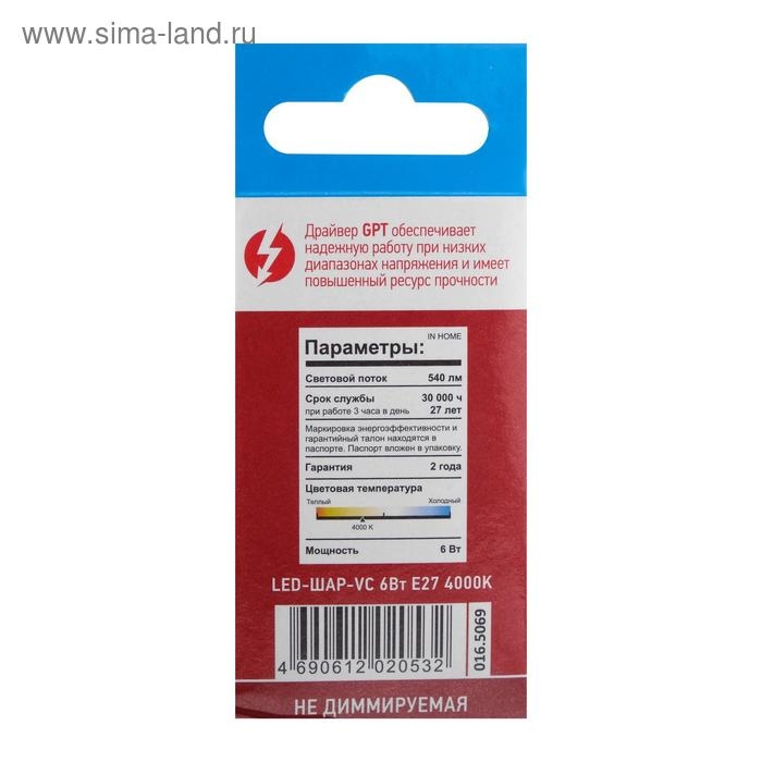 Лампа светодиодная IN HOME LED-ШАР-VC, Е27, 6 Вт, 230 В, 4000 К, 540 Лм
