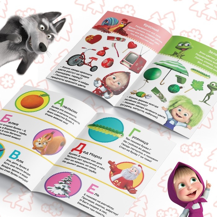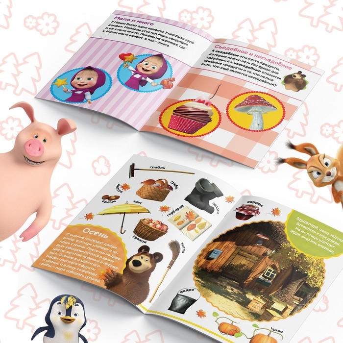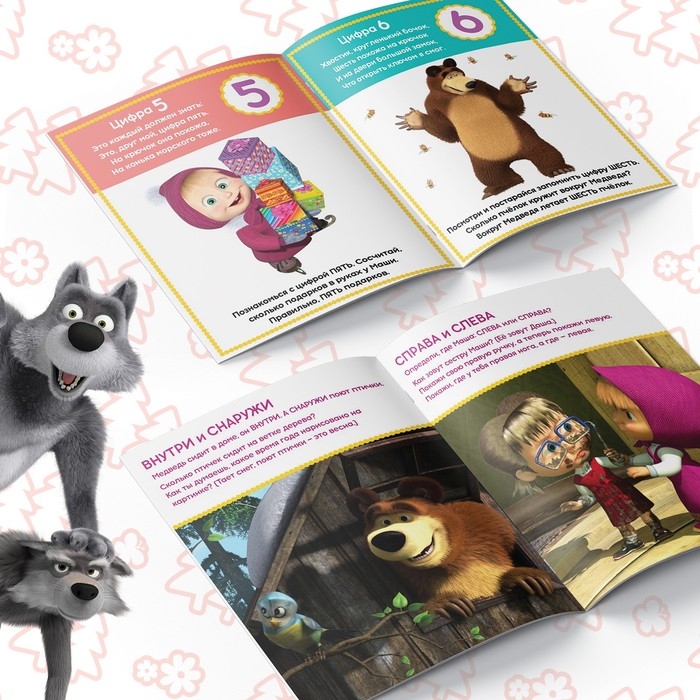 Внутри книг вы найдёте интересные задания, которые помогут ребёнку в игровой форме освоить алфавит, цифры, счёт до 10, запомнить цвета, узнать времена года и научиться определять время. Также в книгах есть забавные иллюстрации с любимыми героями мультфильма «Маша и Медведь».