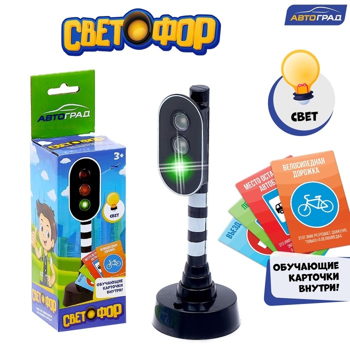 Светофор «Город» научит малыша правилам безопасности во время прогулок на улице. Обучающие карточки в наборе помогут ребёнку изучить знаки дорожного движения, по которым он сможет ориентироваться на проезжей части. Светофор в комплекте имеет световые эффекты, они помогут воссоздать реальную ситуацию на дороге, придумать варианты развития событий и заранее обезопасить себя от чрезвычайных ситуаций.