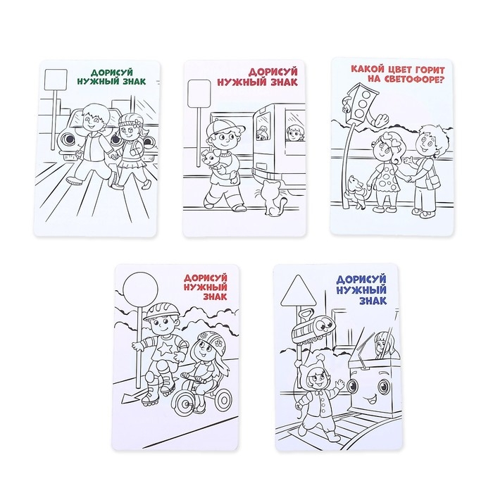 - В комплект входят 5 обучающих карточек с заданиями, которые объяснят значения дорожных знаков.