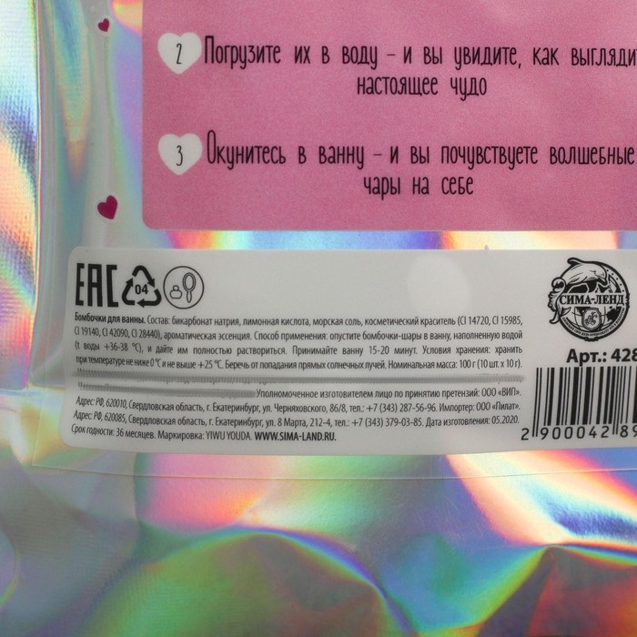 Состав: бикарбонат натрия, лимонная кислота, морская соль, косметический краситель, ароматическая эссенция.