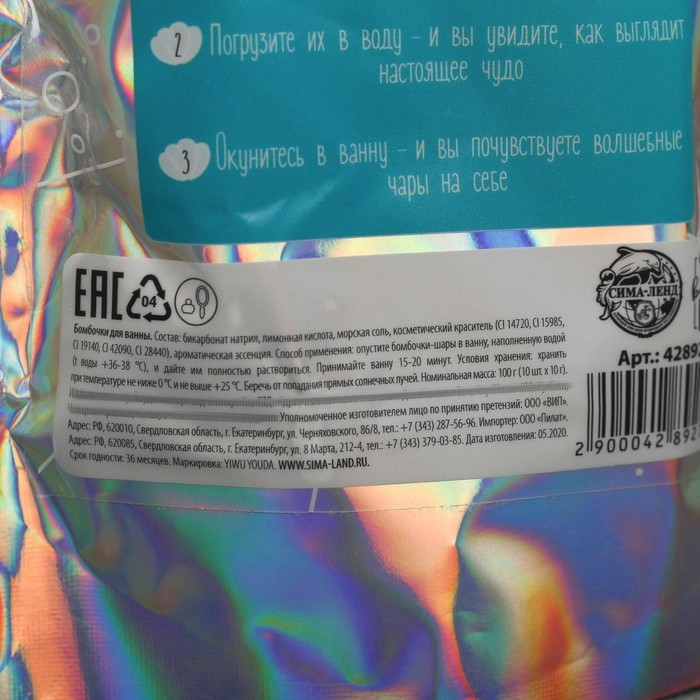 Состав: бикарбонат натрия, лимонная кислота, морская соль, косметический краситель (CI 14720, CI 15985, CI 19140, CI 42090, CI 28440), ароматическая эссенция.
