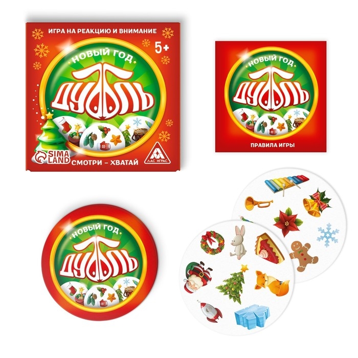 Это новогодняя игра сделает праздник незабываемым, а заодно проверит ваше внимание и реакцию! Внутри ждут карты с уникальным набором картинок, на каждой паре есть общее изображение. Ищите совпадения быстрее всех и побеждайте!